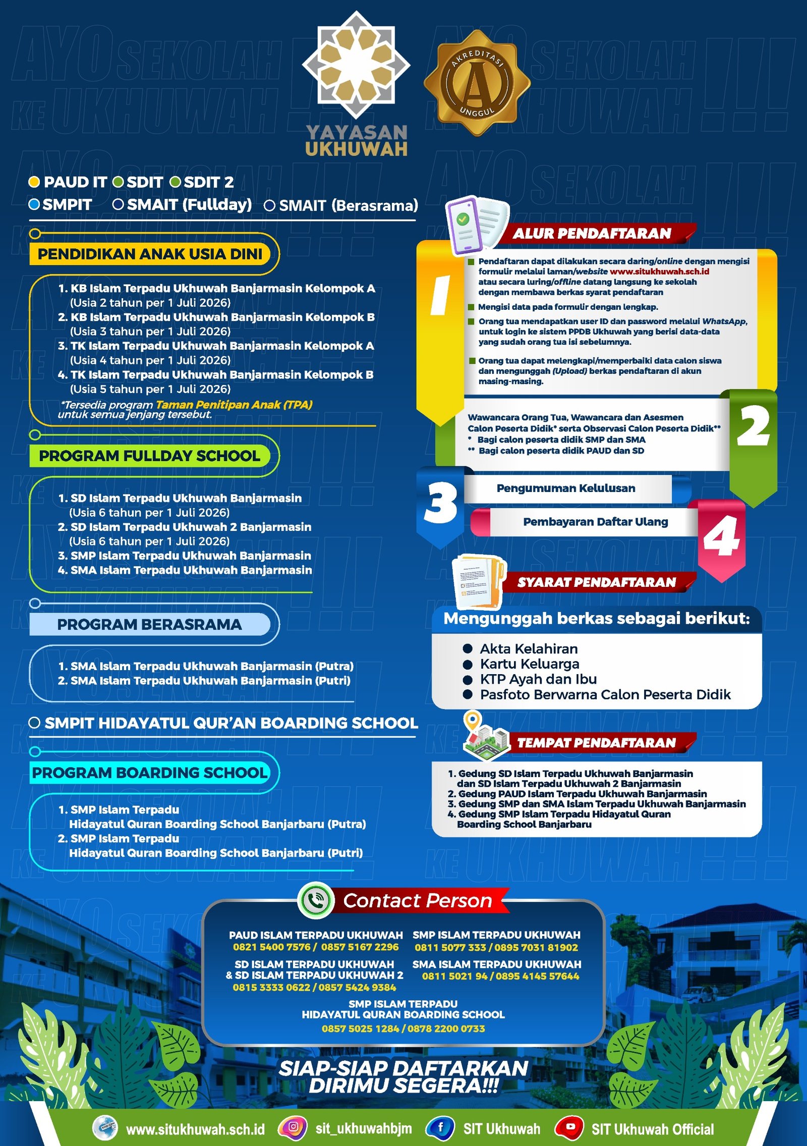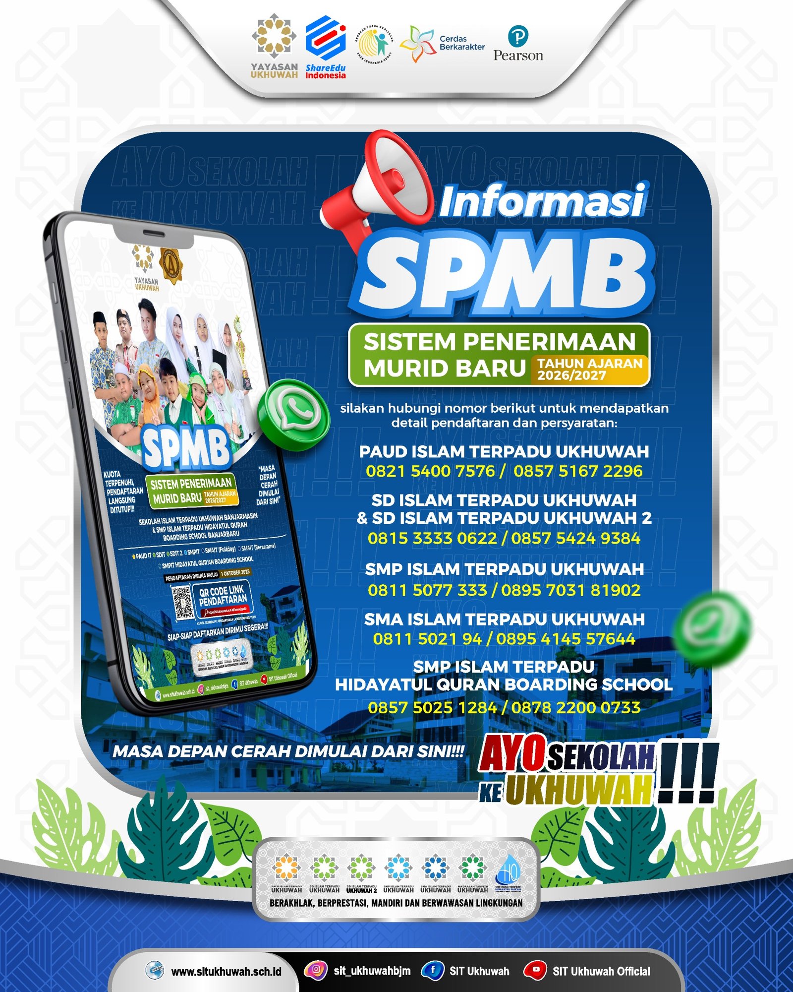 Selamat datang di website resmi SD Islam Terpadu Ukhuwah. Sebagai lembaga pendidikan yang mengedepankan nilai-nilai Islam dan pembelajaran terpadu, kami berkomitmen untuk membentuk generasi muda yang berakhlak, berprestasi, mandiri, dan berwawasan lingkungan. Melalui website ini, kami berharap dapat memberikan informasi yang bermanfaat serta mempererat silaturahmi antara sekolah, orang tua, dan masyarakat.